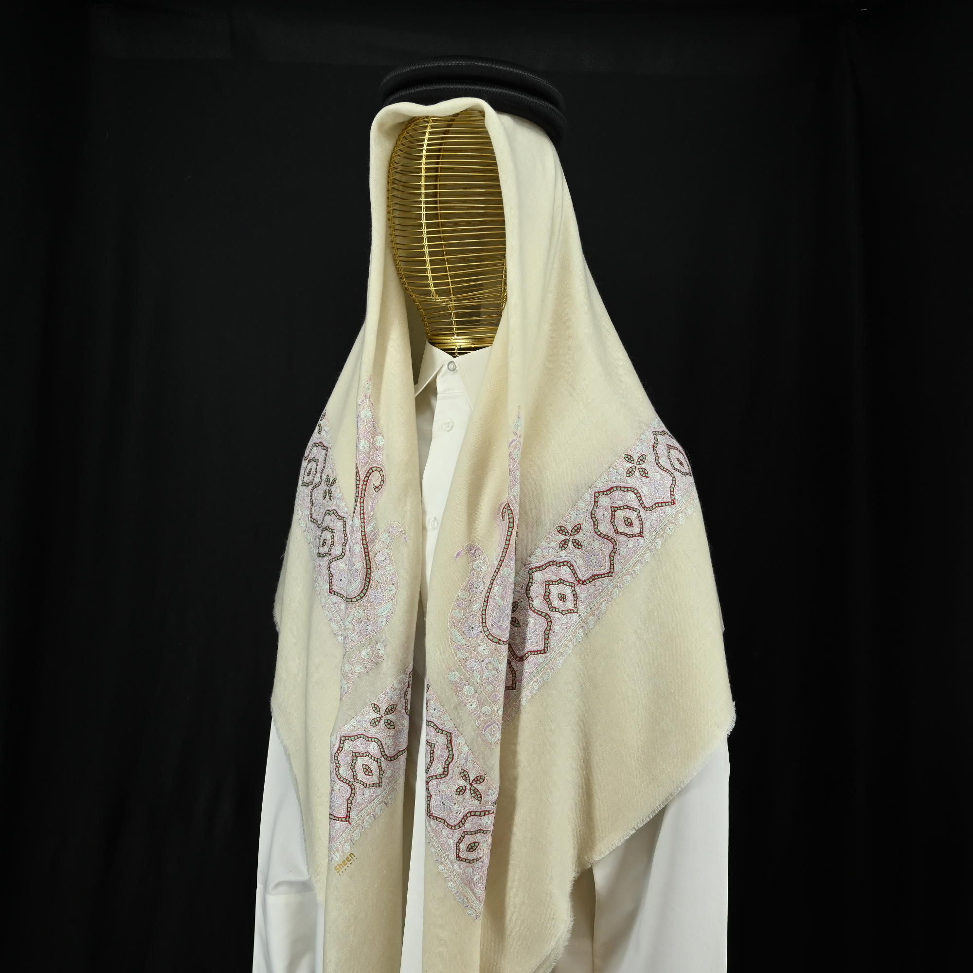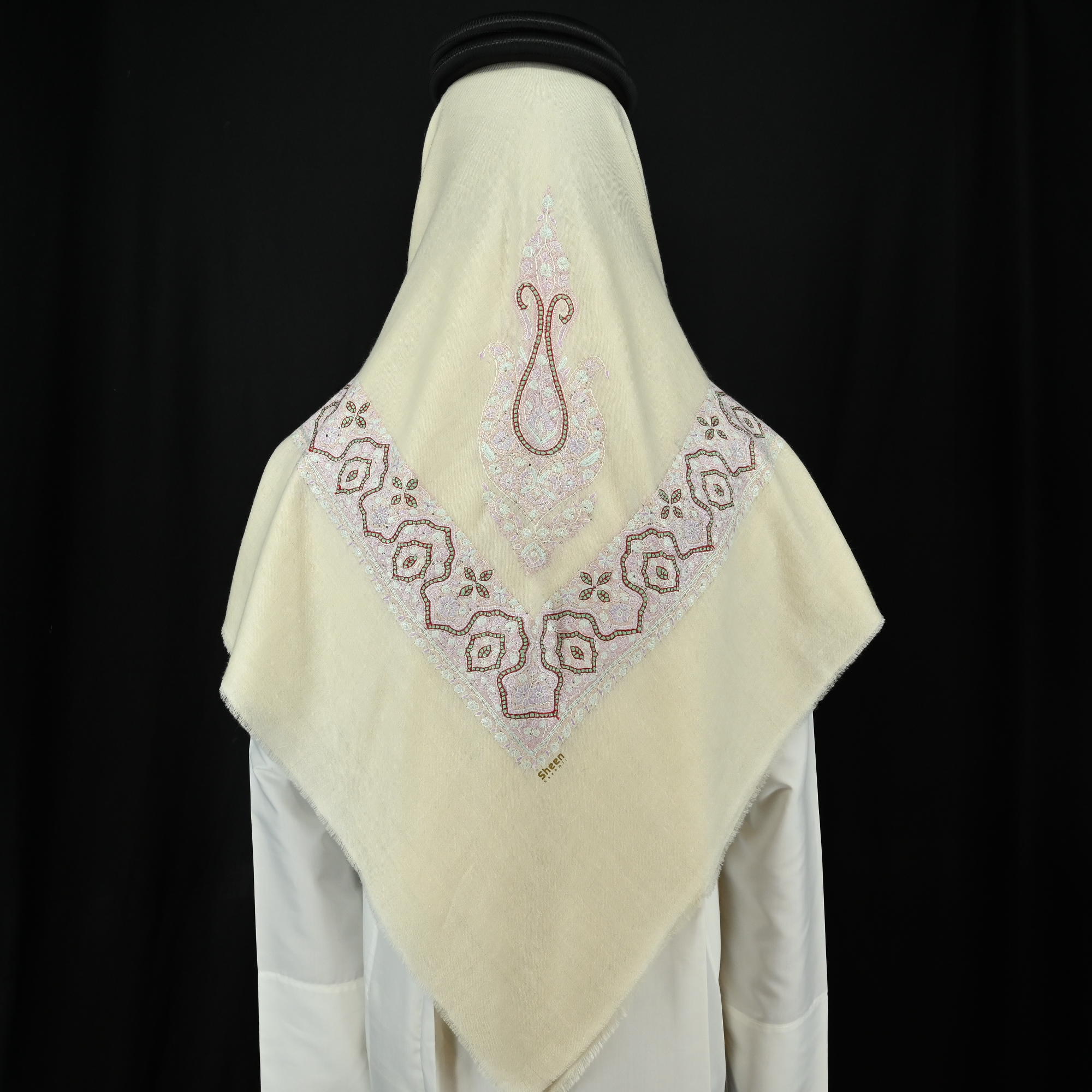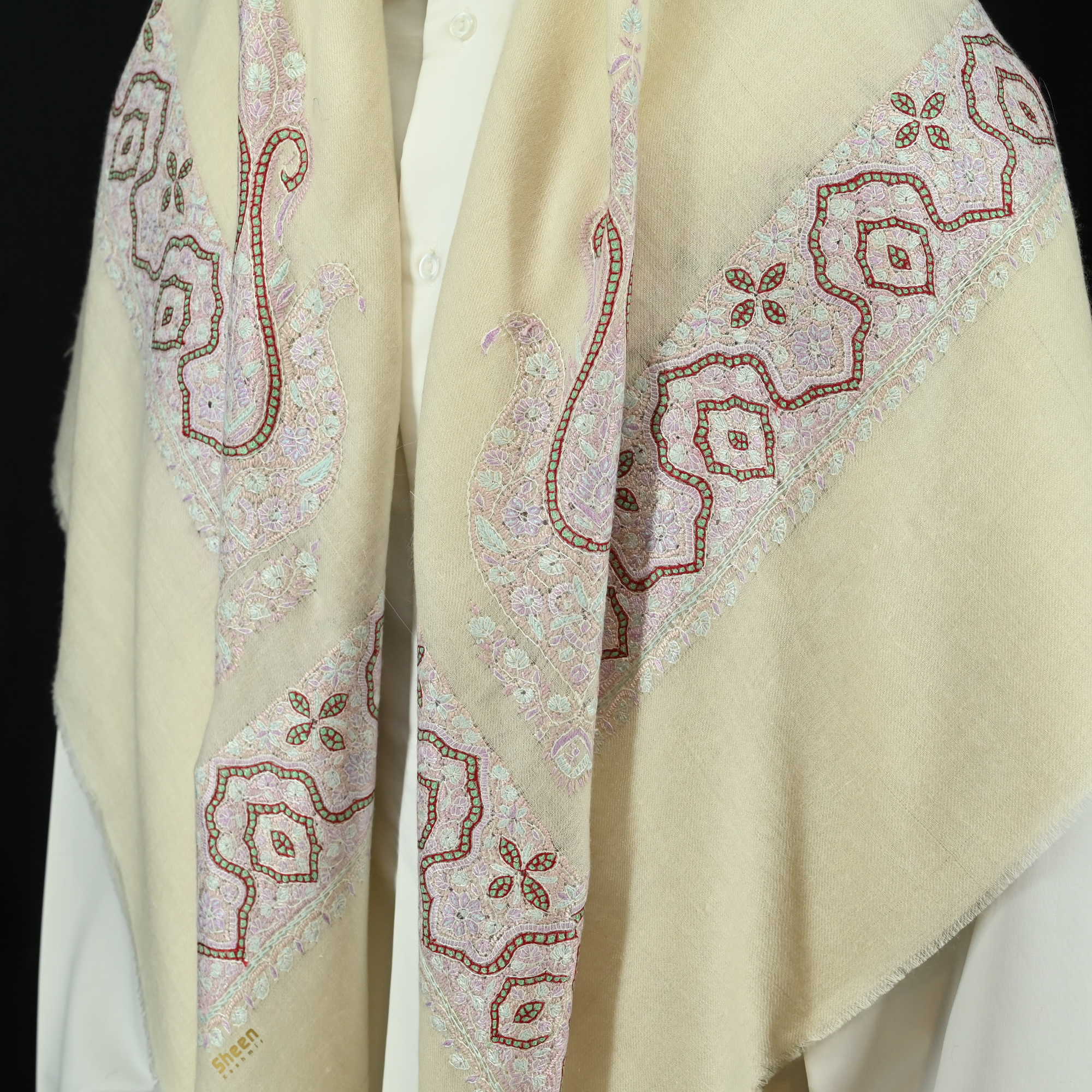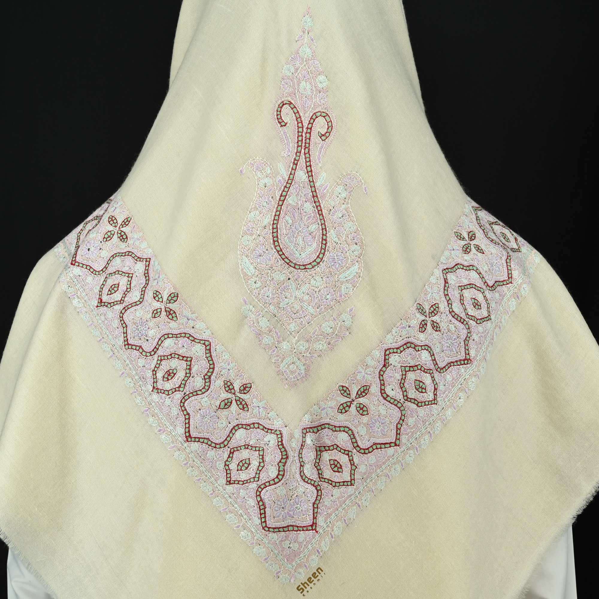 Sheenasic edition Kashmiri shawl with Light Pink pattern Hand Embroidery and White Base