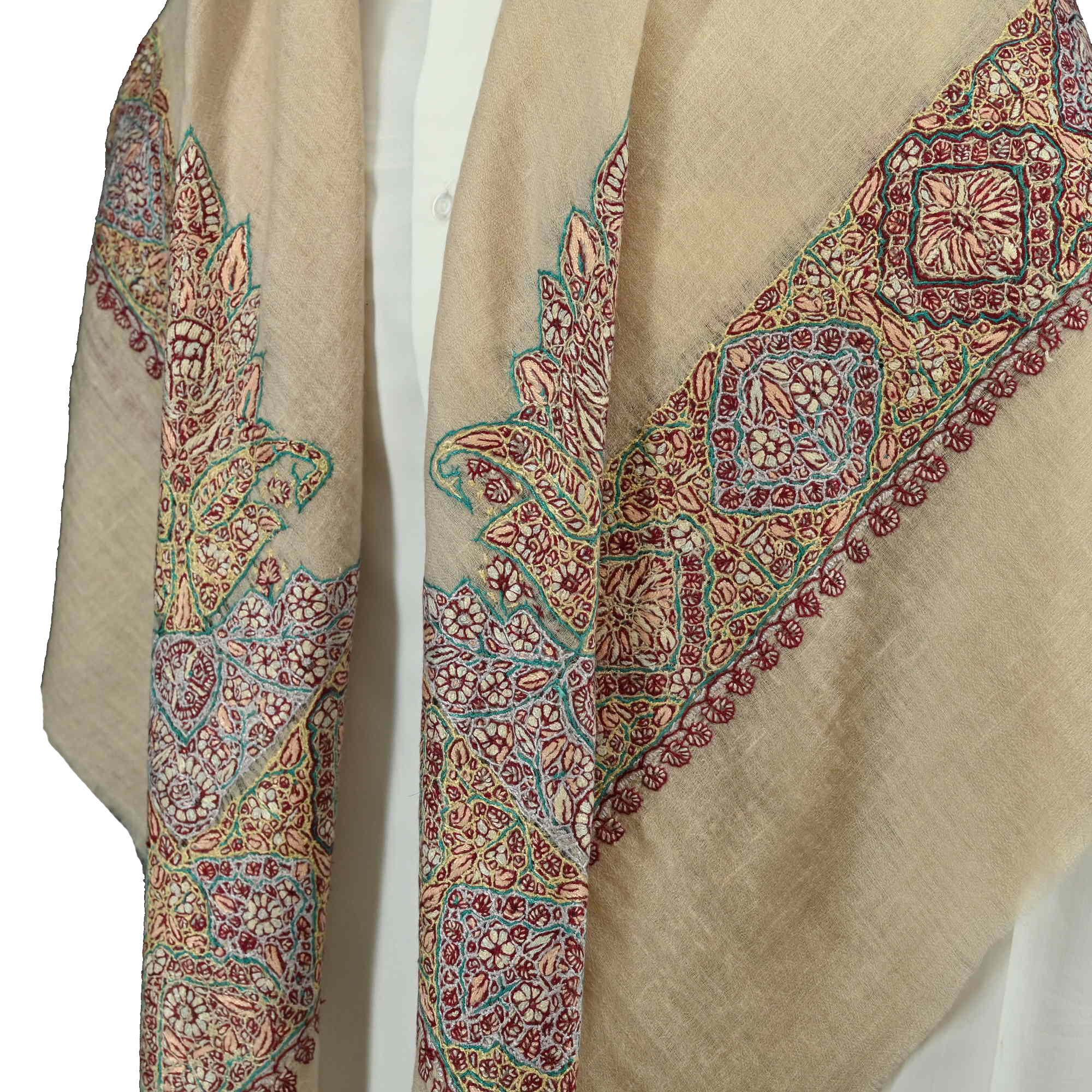 شال كشميري إصدار شيناسيك مع تطريز يدوي بنمط الخردل / البني وقاعدة بيج