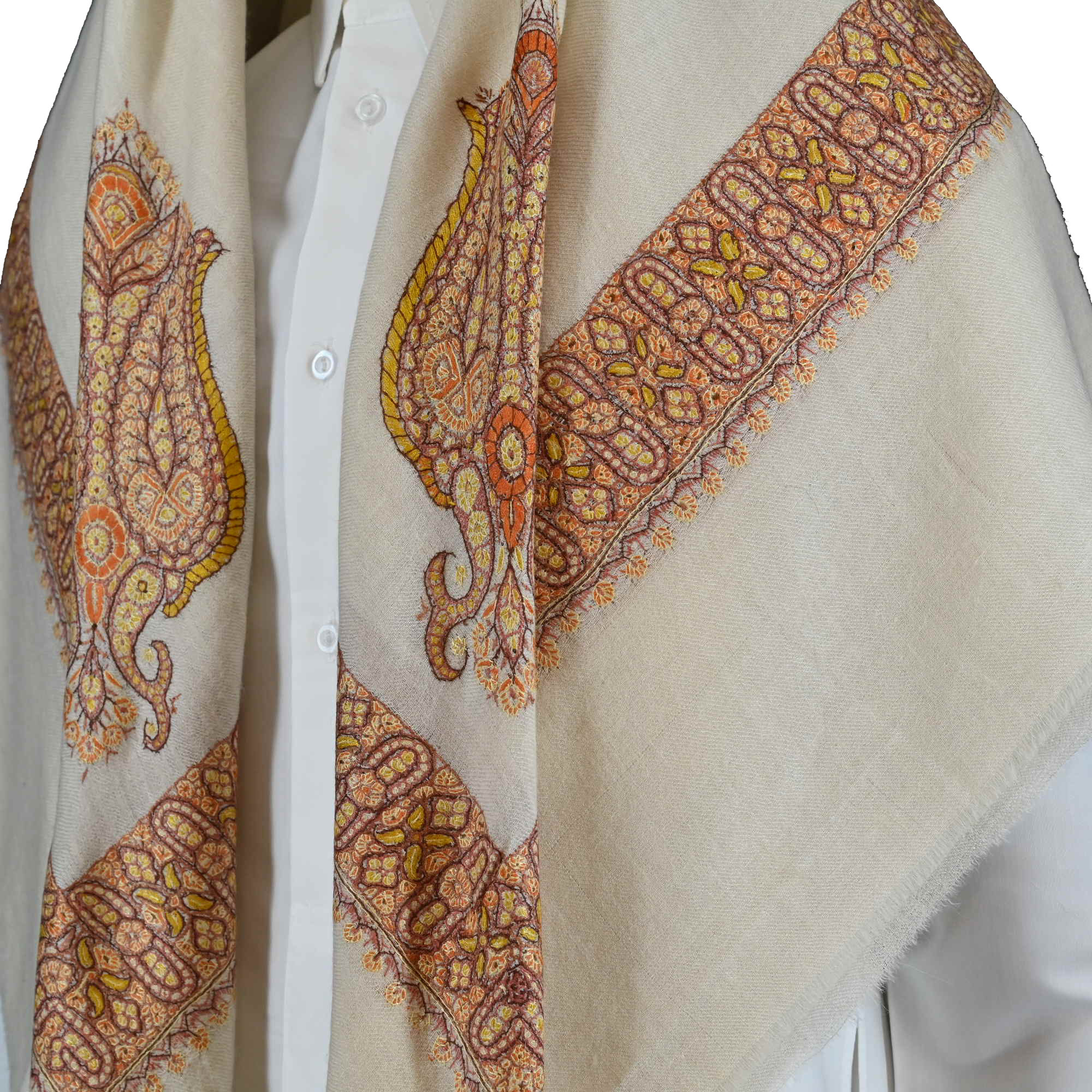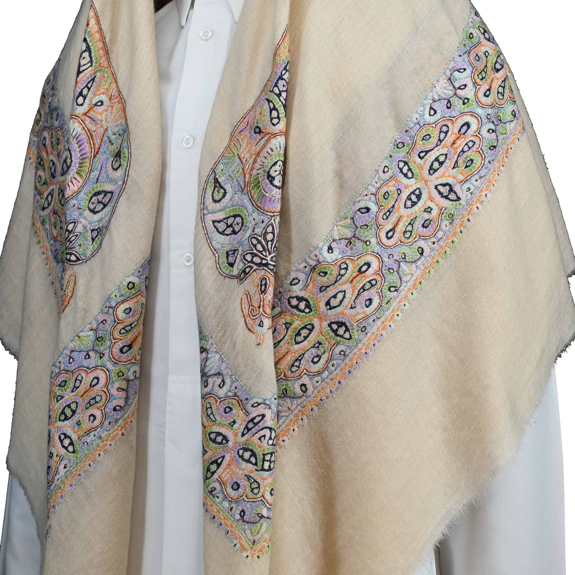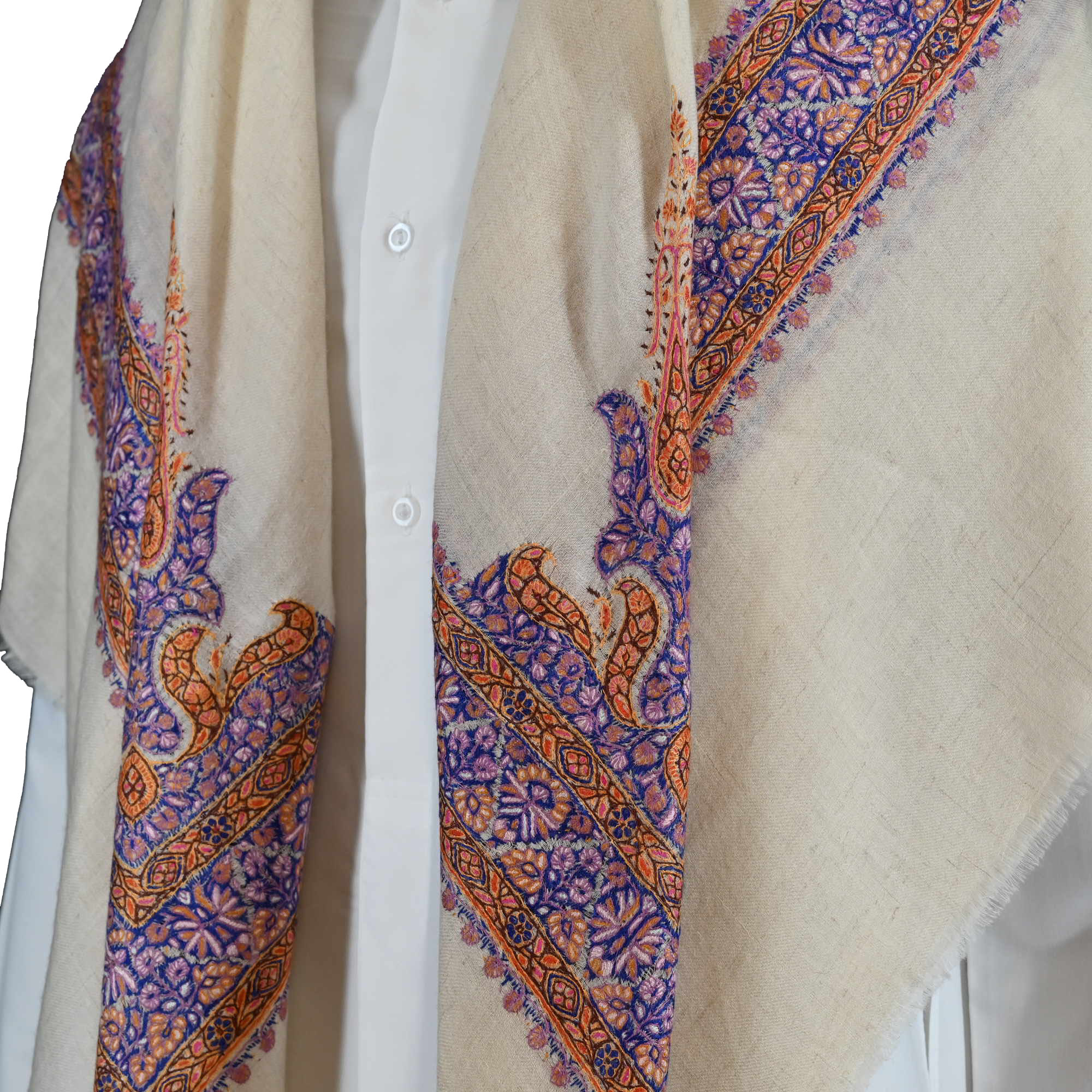 Contemporary edition Kashmiri shawl with Light shades Hand Embroidery and Natural White Base