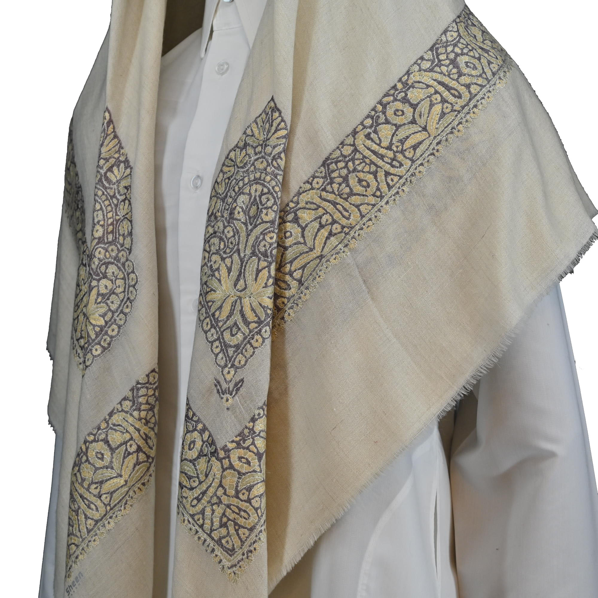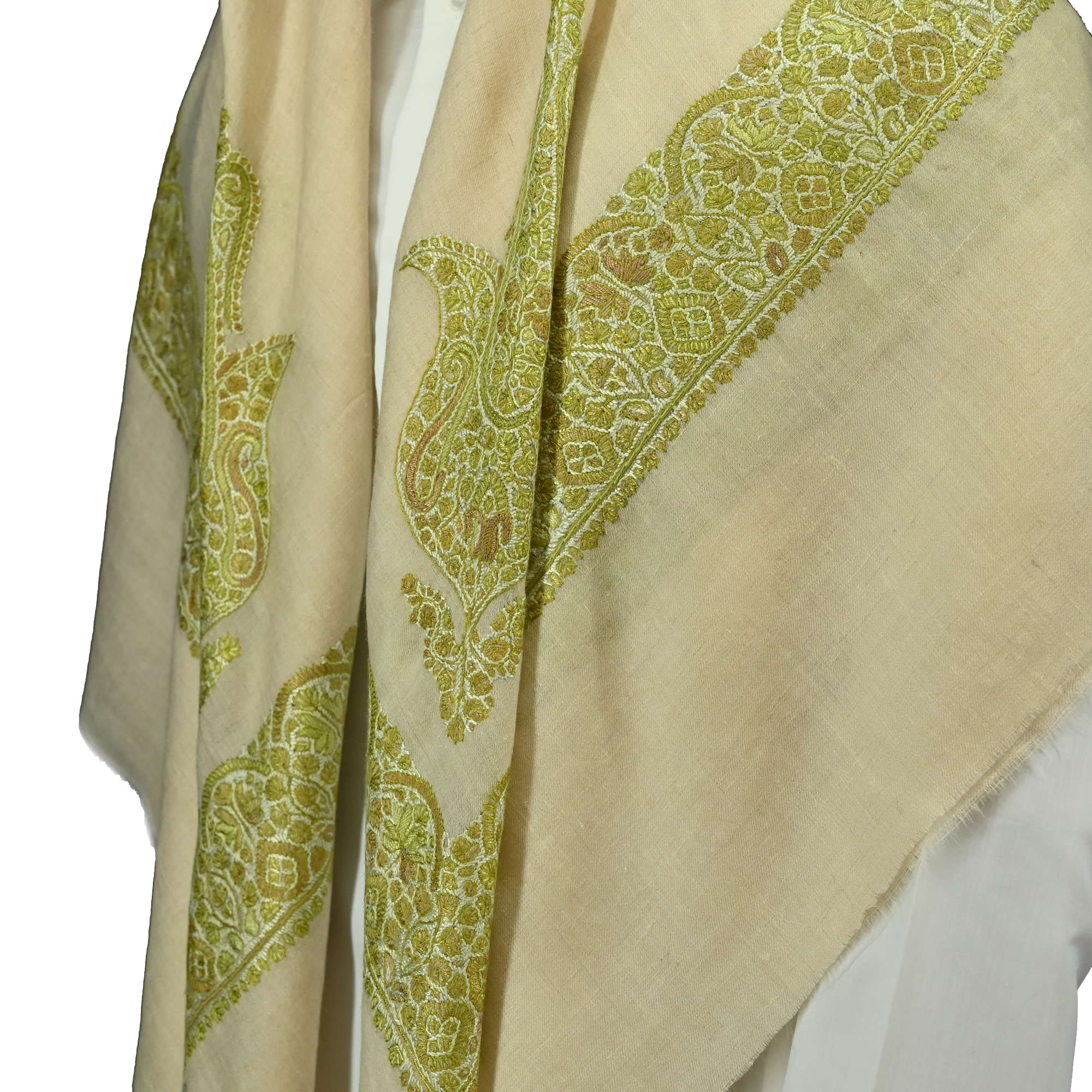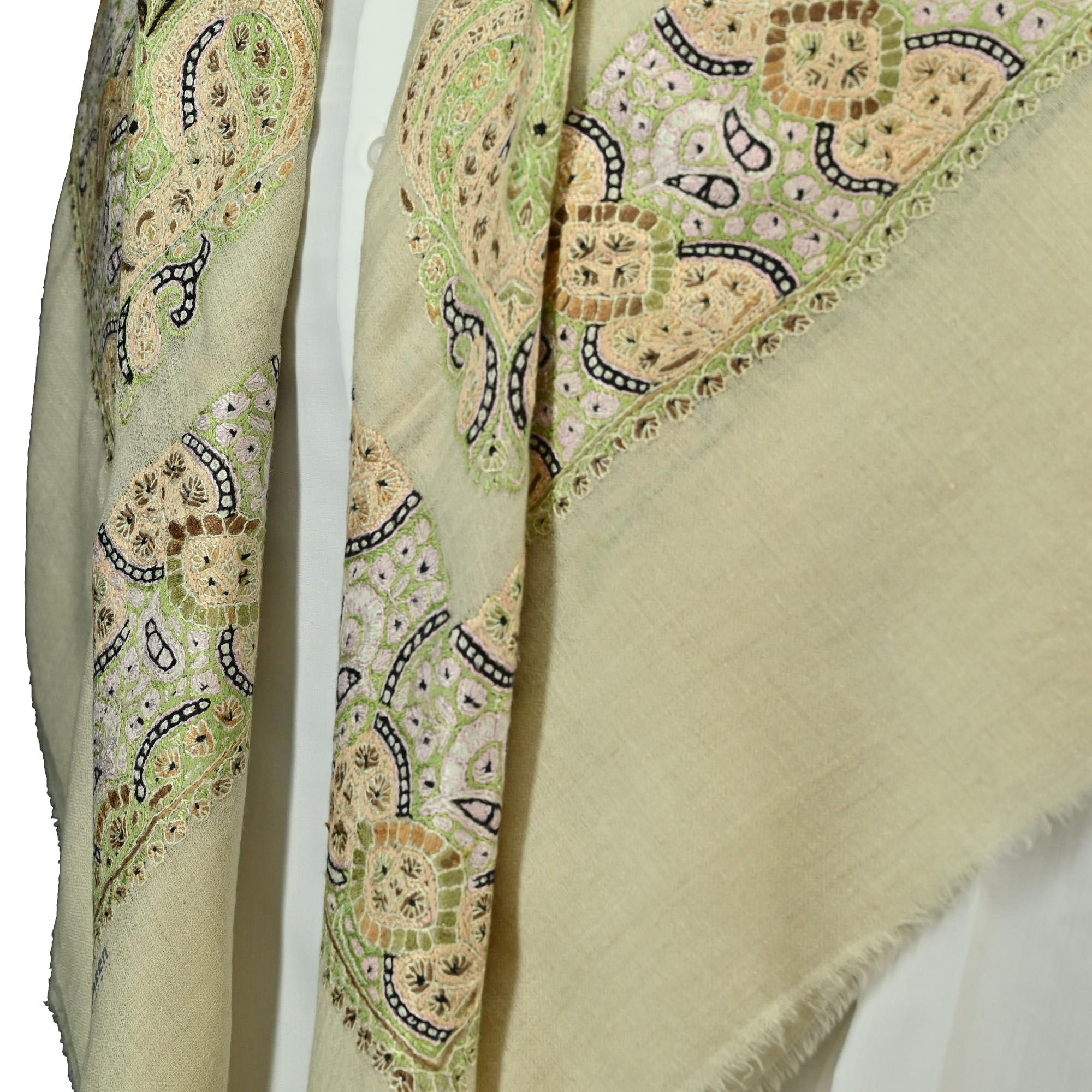 Contemporary edition Kashmiri shawl with Green shades pattern Hand Embroidery and Natural White Base
