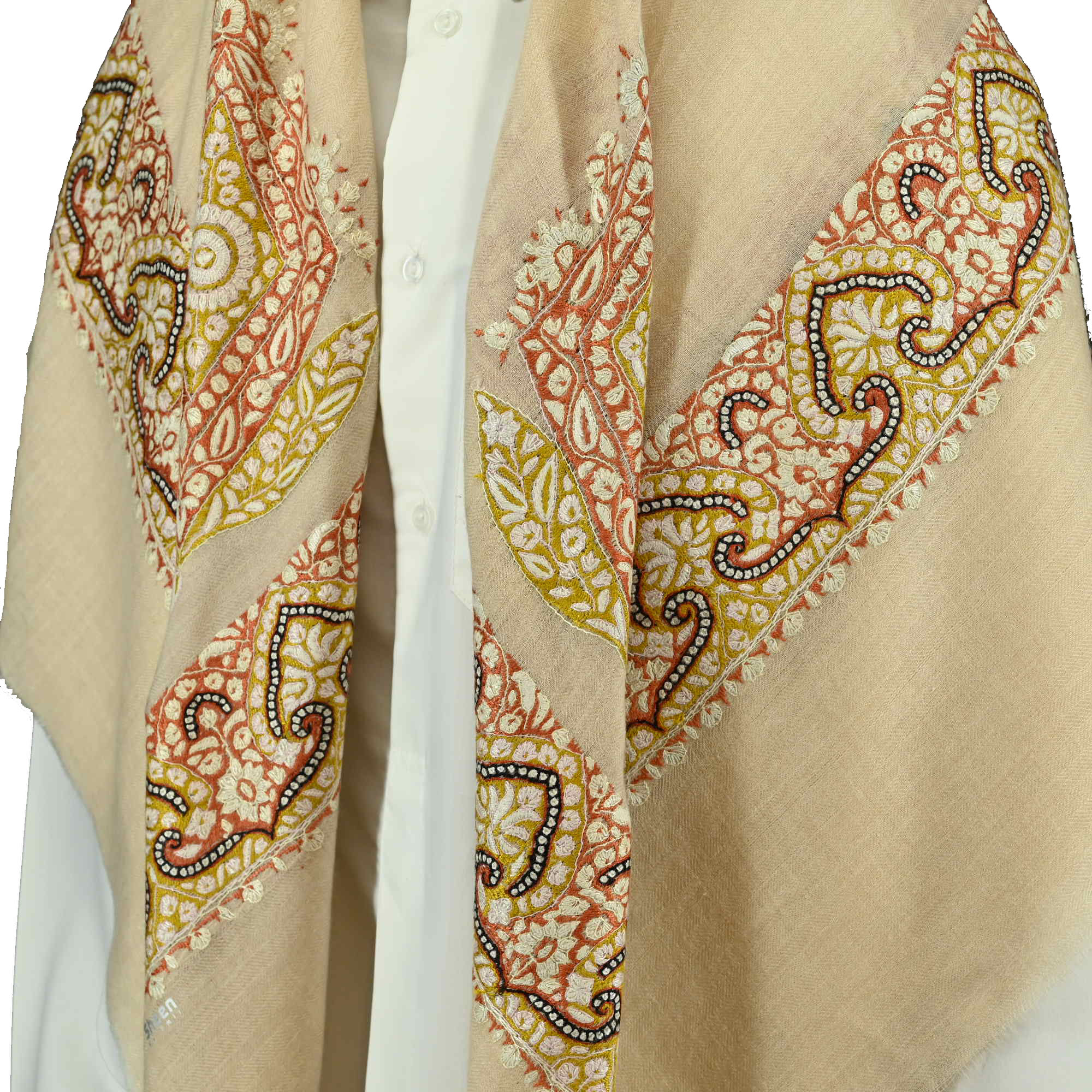 Sheenasic edition Kashmiri shawl with Mustard/Brown pattern Hand Embroidery and Beige Base
