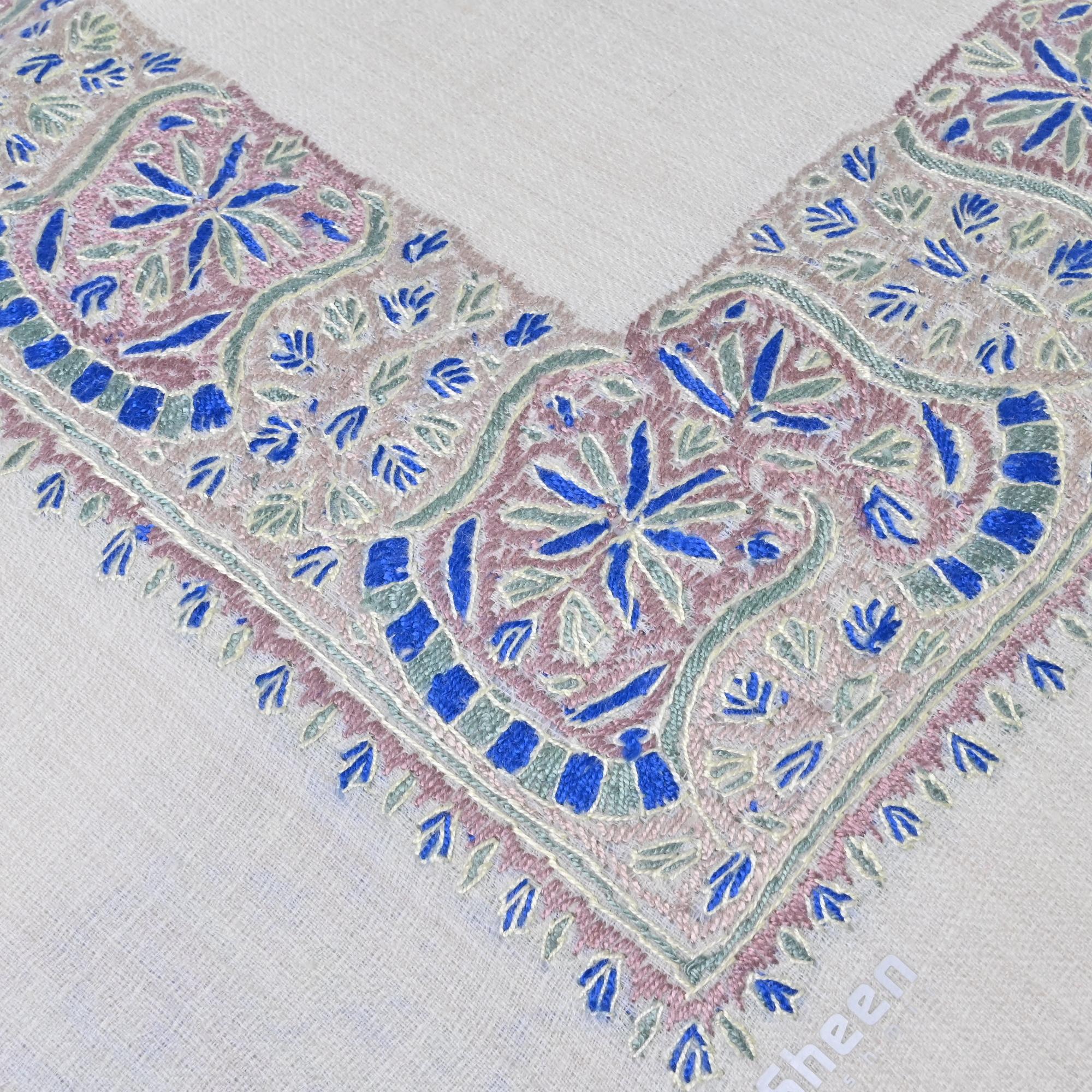 The Contemporary pattern Shawl with shades of green and blue embroidery is a luxury item made from the finest cashmere and is perfect for adding a splash of color and luxurious warmth to any outfit. Each shawl is hand embroidered by skilled artisans in Kashmir, who produce only the finest quality Shawls. The result of many hours work, this Shawl will add a dash of color to any outfit.