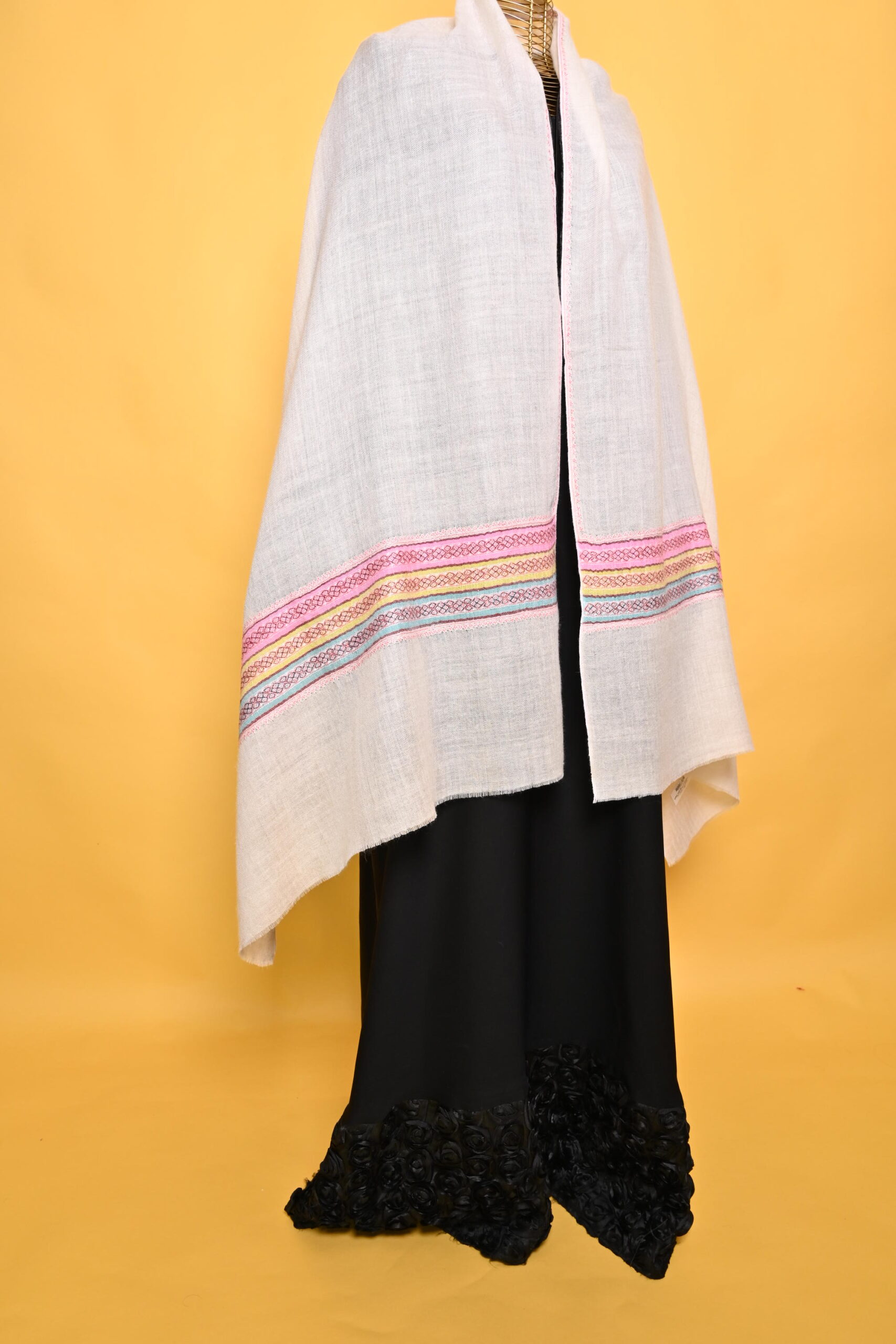 Kashmiri Designer Stole with Border work multicolor thread hand embroidery and Natural White color Pashmina Fabric